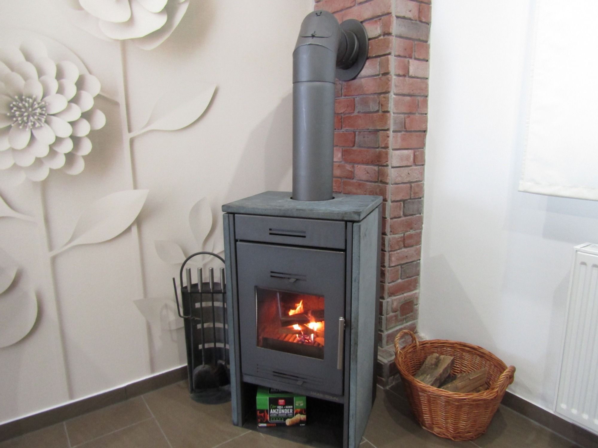 In der Küche gibt es einen Holzofen mit Specksteinverkleidung.
