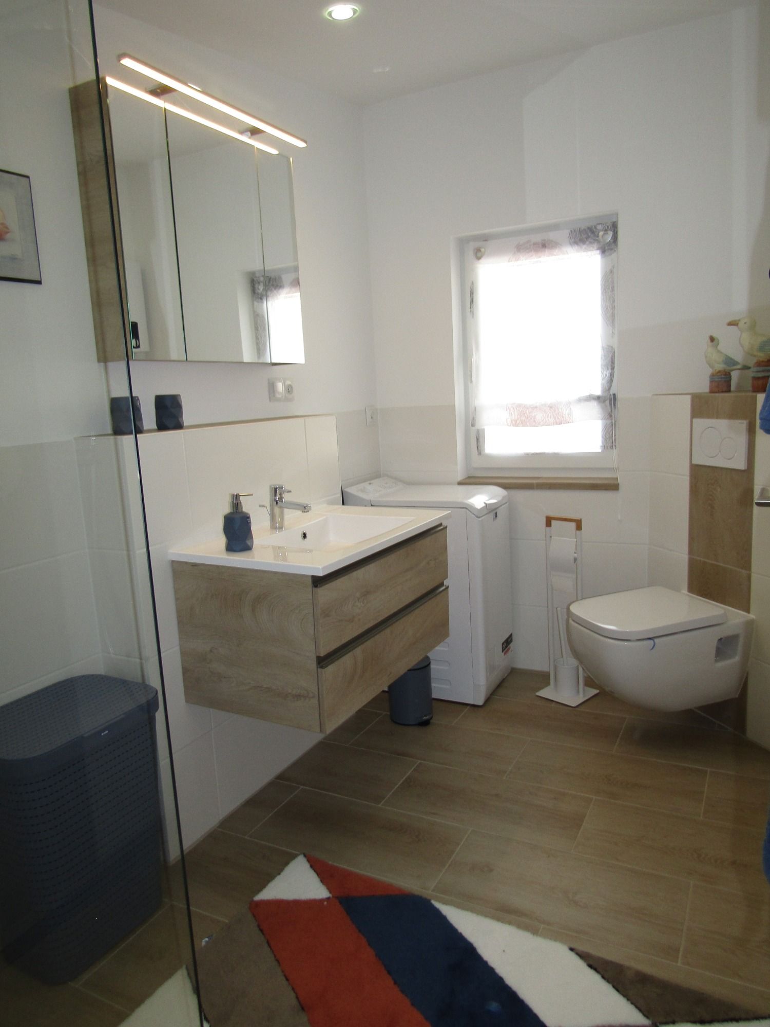 Sie finden ein modernes Bad mit ebenerdiger Dusche, Waschbecken, WC, Waschmaschine und Tageslicht vor.