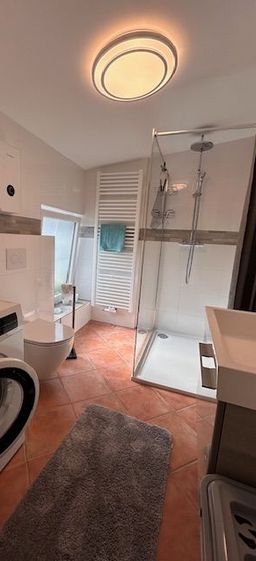Sie finden ein modernes Bad mit ebenerdiger Dusche, Waschbecken, WC, Waschmaschine und Tageslicht vor.