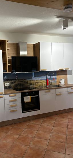 Die Küche ist voll ausgestattete mit Induktionskochfeld, Wasserkocher, Kühlschrank mit Gefrierteil, Besteck, Geschirr, Töpfe, Toaster, Wischtücher und Kaffeemaschine.
